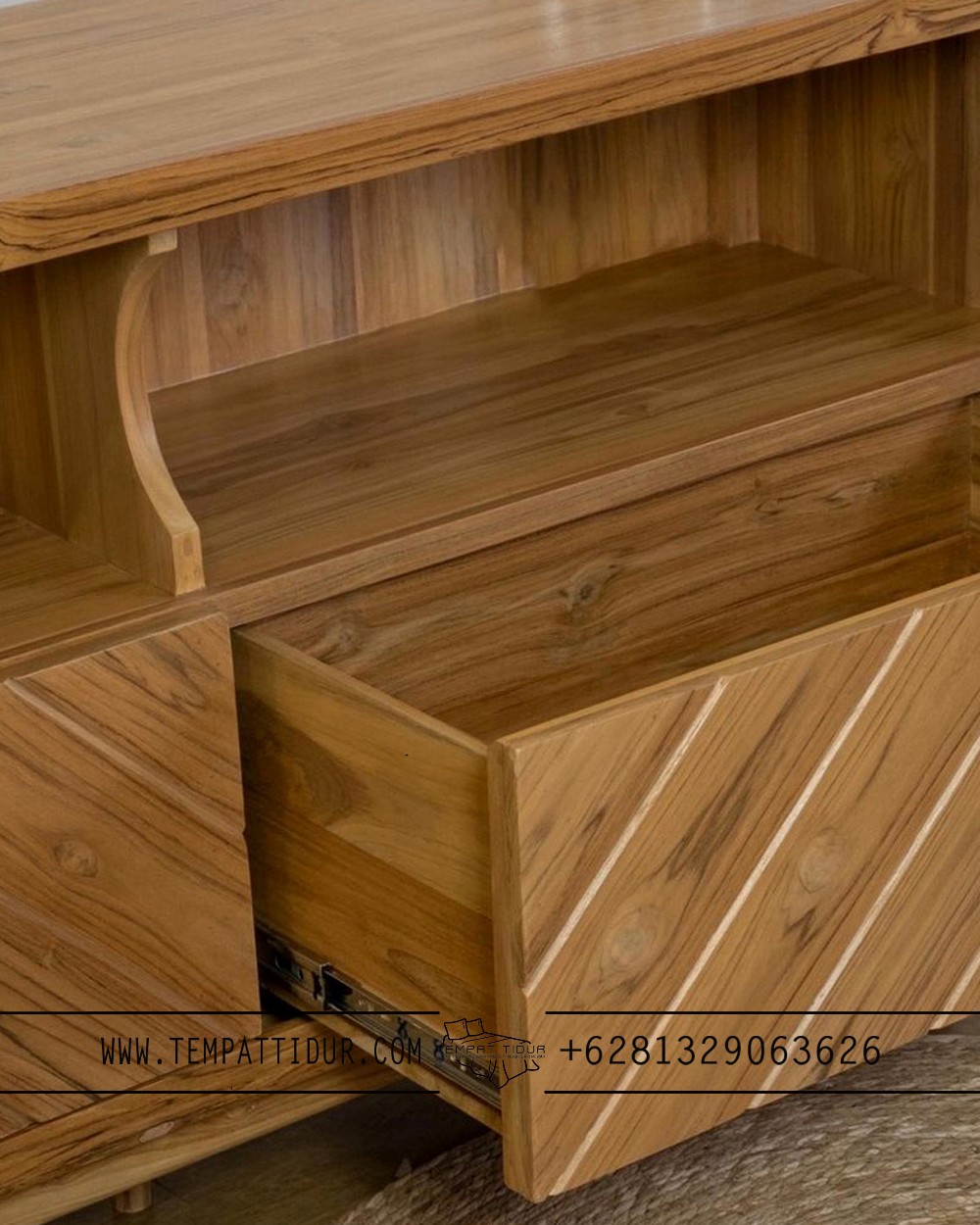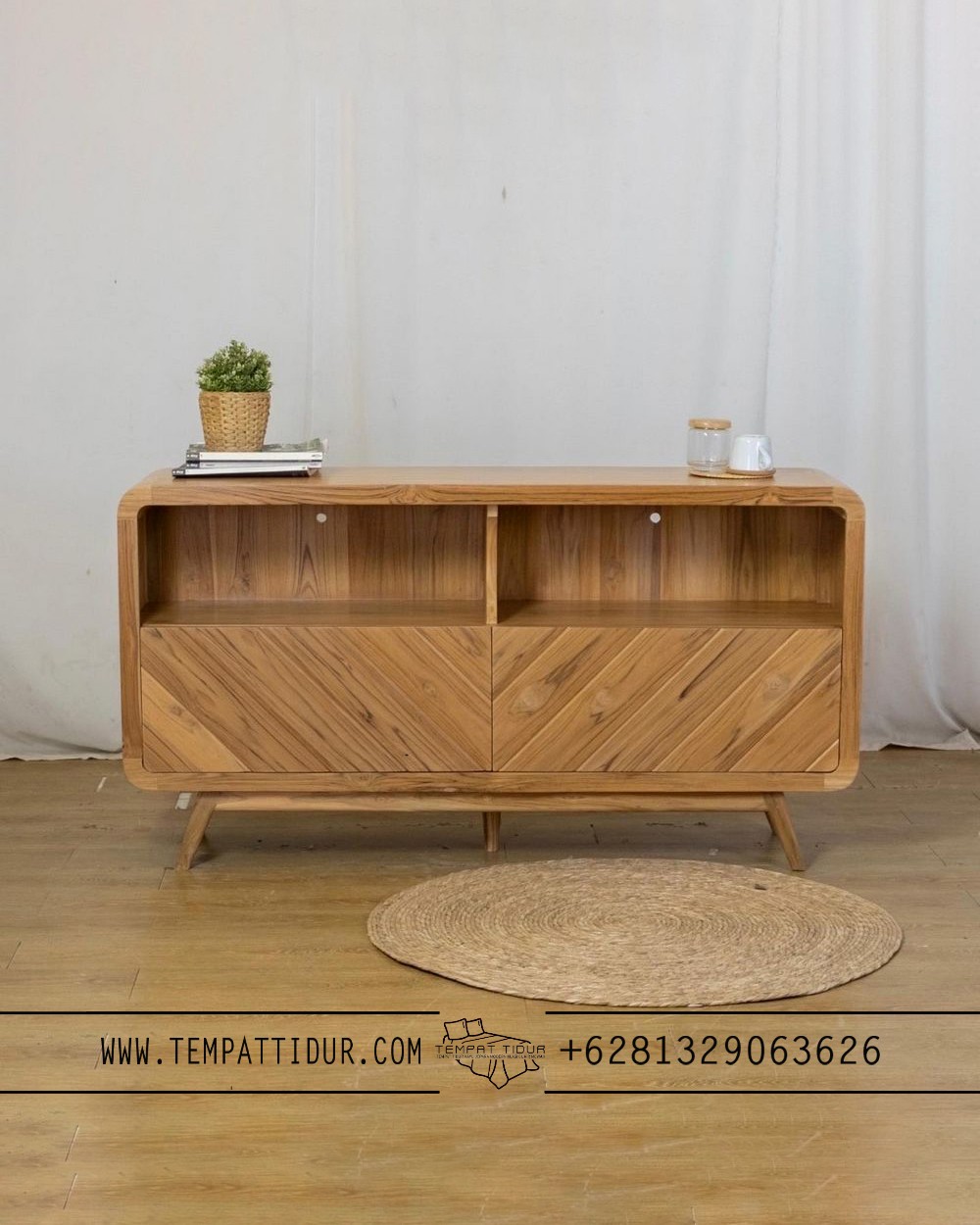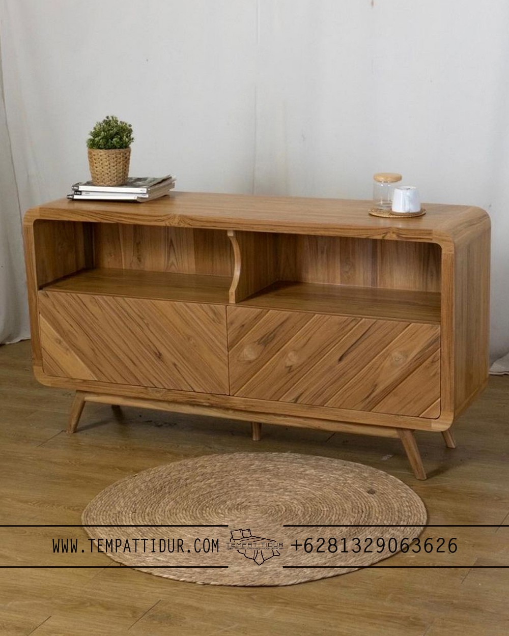 Bufet jati jepara minimalis 2 pintu salur V TT-053 – Lebih dari sekadar tempat simpan TV atau multimedia, bufet dua pintu ini adalah solusi penyimpanan ekstra yang cerdas sekaligus aksen dekoratif yang langsung menghangatkan suasana ruangan. Bayangkan saja: bagian atasnya menawarkan dua rak terbuka yang lapang dan super serbaguna, sempurna untuk memajang koleksi buku favorit, tanaman hias yang segar, foto keluarga penuh kenangan, atau pernak-pernik dekorasi yang mencerminkan kepribadian Anda, semuanya terlihat rapi dan mudah dijangkau.