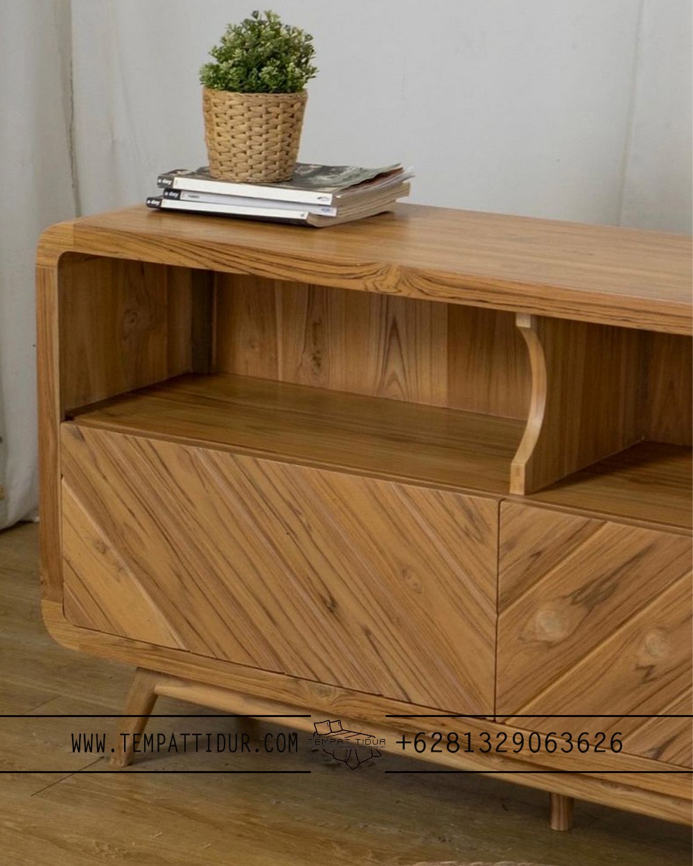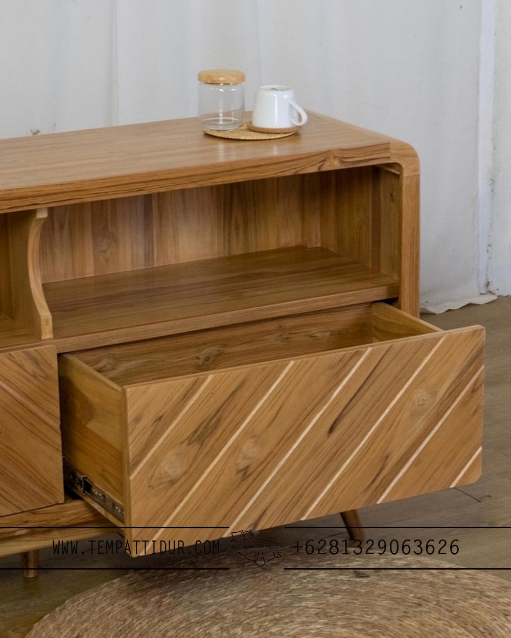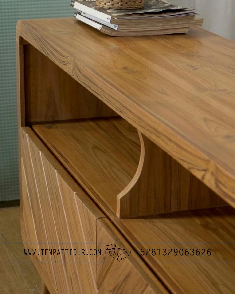Bufet jati jepara minimalis 2 pintu salur V TT-053 – Lebih dari sekadar tempat simpan TV atau multimedia, bufet dua pintu ini adalah solusi penyimpanan ekstra yang cerdas sekaligus aksen dekoratif yang langsung menghangatkan suasana ruangan. Bayangkan saja: bagian atasnya menawarkan dua rak terbuka yang lapang dan super serbaguna, sempurna untuk memajang koleksi buku favorit, tanaman hias yang segar, foto keluarga penuh kenangan, atau pernak-pernik dekorasi yang mencerminkan kepribadian Anda, semuanya terlihat rapi dan mudah dijangkau.