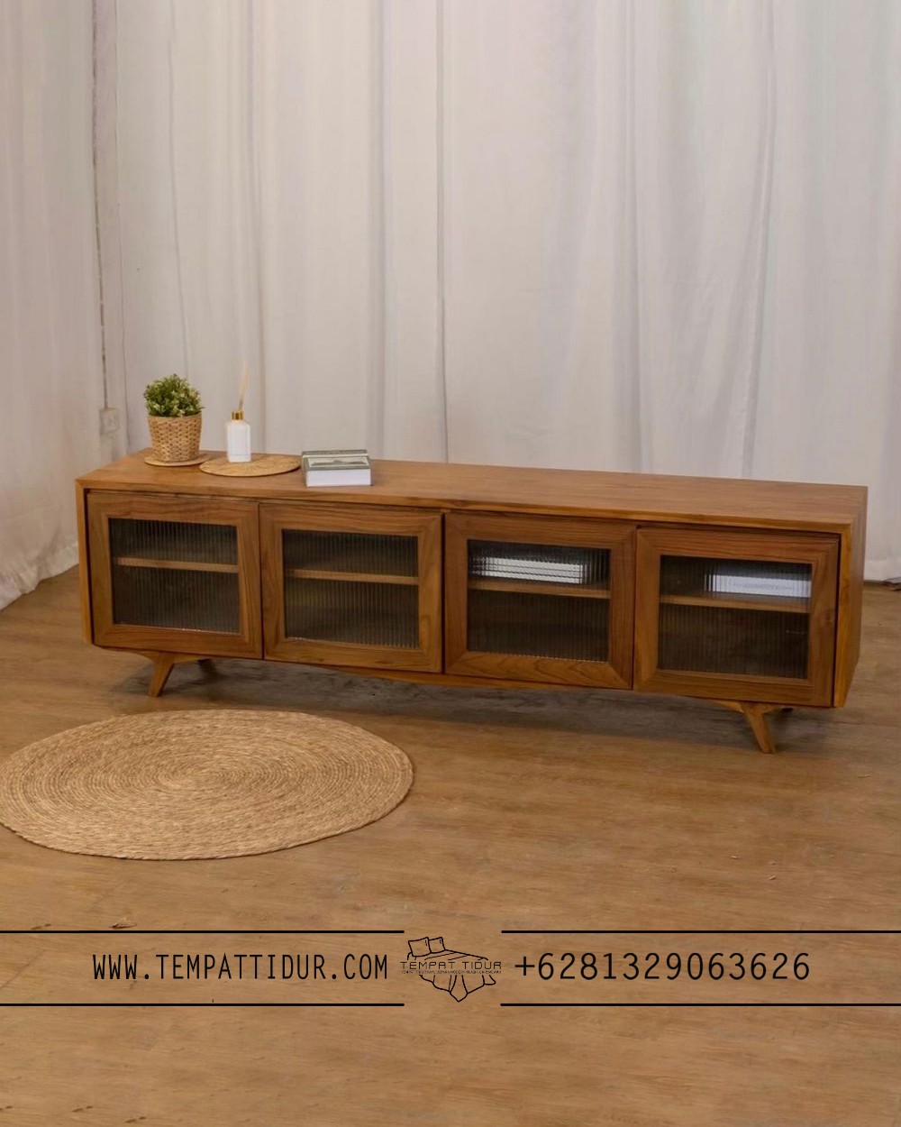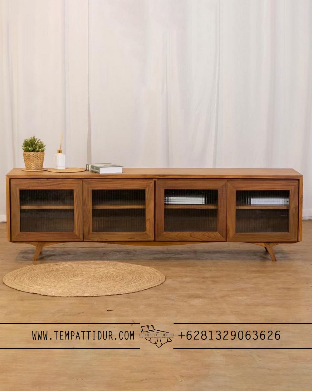 Bufet jati minimalis 4 pintu retro japandi TT-026 – Karya fungsional ini mengharmonisasikan gaya Japandi yang timeless—paduan simpel ala Skandinavia dan estetika natural Jepang—dalam desain minimalis modern yang mudah berpadu dengan berbagai konsep interior. Empat pintunya yang kokoh, dipadukan dengan panel kaca bening jernih, memungkinkanmu memamerkan koleksi terbaik seperti buku, aksesori dekoratif, atau pernak-pernik kesayangan sembari menjaga kebersihannya. Tak sekadar jadi penyimpanan ekstra yang lapang untuk mengatur barang-barang agar rapi, buffet serbaguna ini juga bisa berfungsi sebagai TV console yang stylish, meja display untuk pajangan seni, atau bahkan lembar penyajian hidangan saat kumpul keluarga.