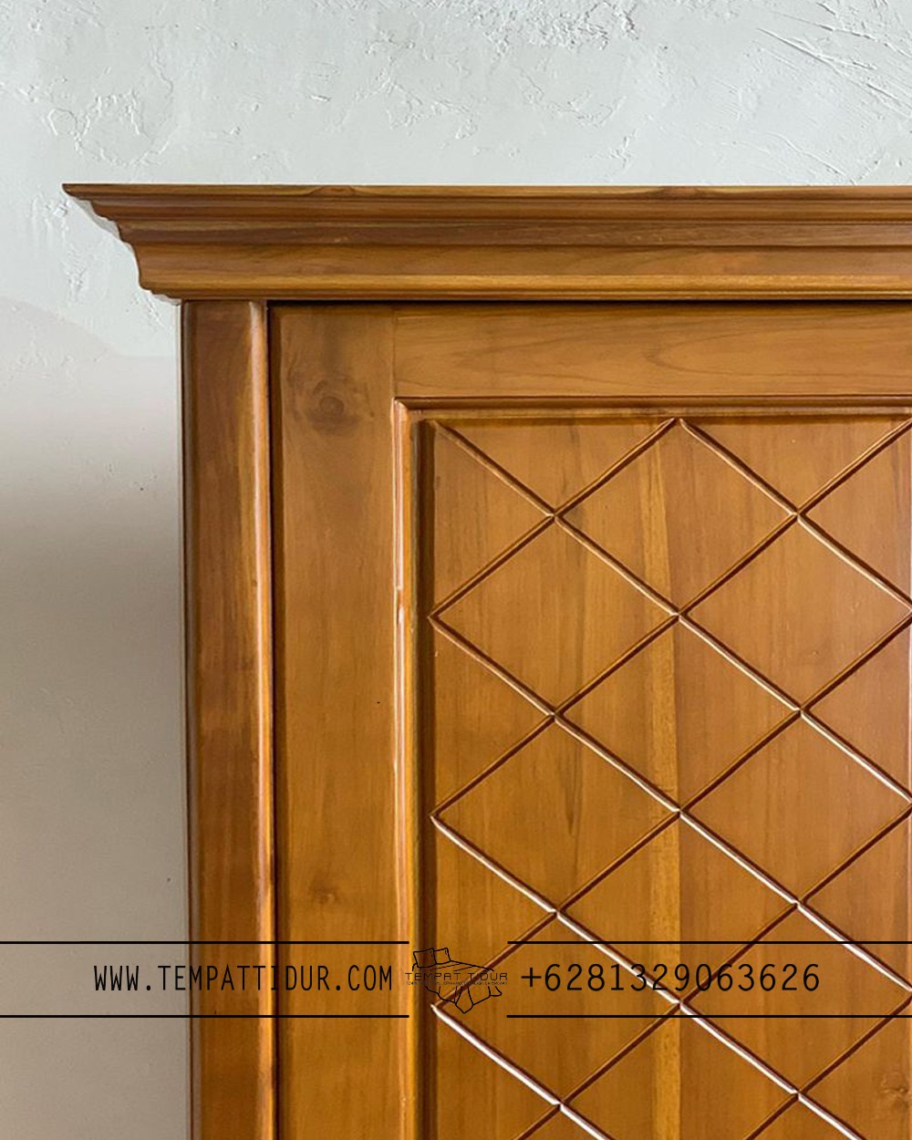 Lemari pakaian jati 2 pintu klasik kontemporer TT-092 – Lemari pakaian ini memadukan pesona klasik yang timeless dengan sentuhan modern yang fresh, cocok untuk berbagai konsep dekorasi ruangan. Desainnya memikat dengan aksen panel kotak belah ketupat yang menawan pada kedua pintunya, menambah detail visual yang menarik dan karakter yang kuat. Sentuhan klasik semakin terasa berkat lis profil yang anggun di bagian atas lemari serta kaki bulat yang kokoh dan estetis di bagian bawahnya, memberikan kesan yang sekaligus klasik dan kontemporer.
