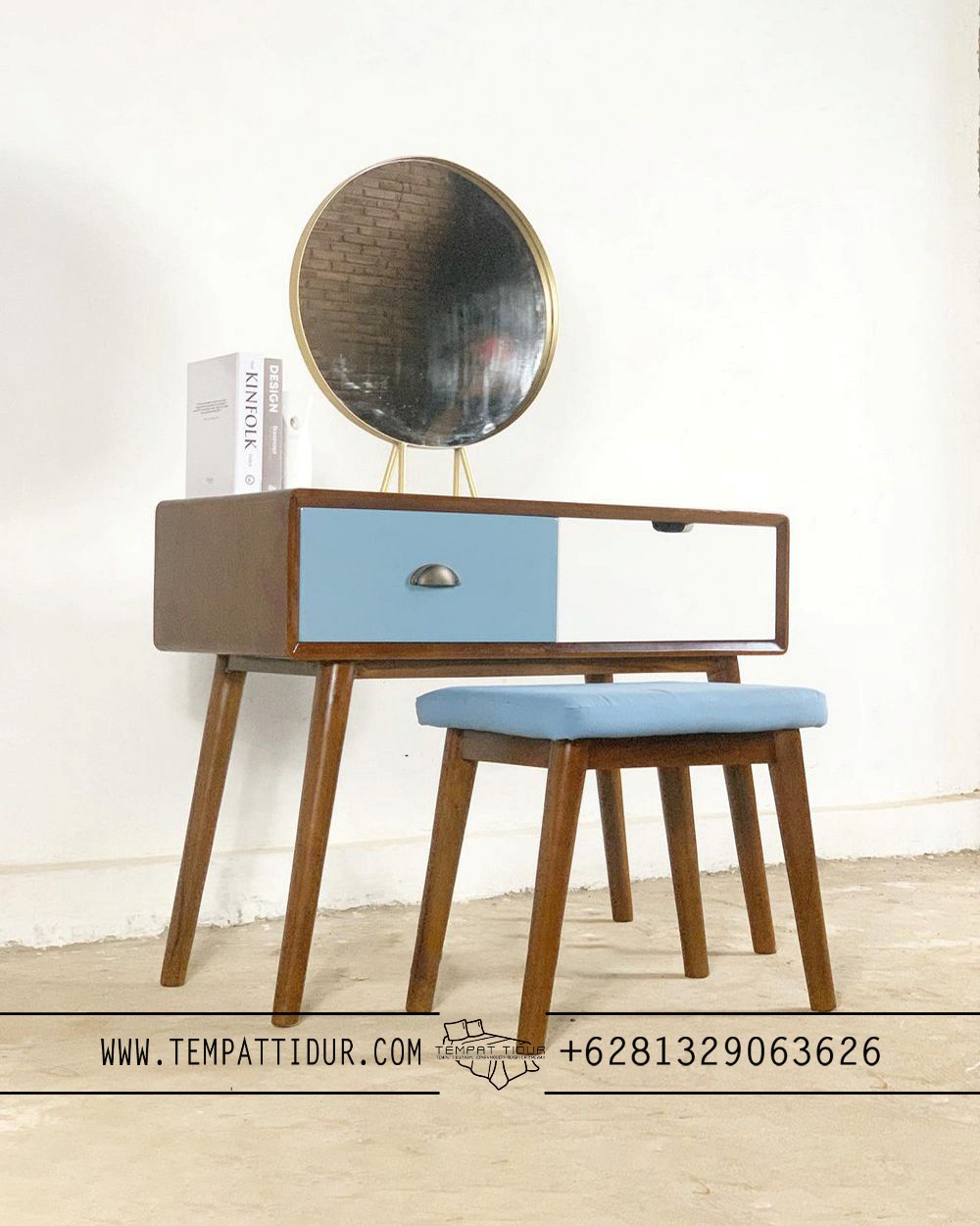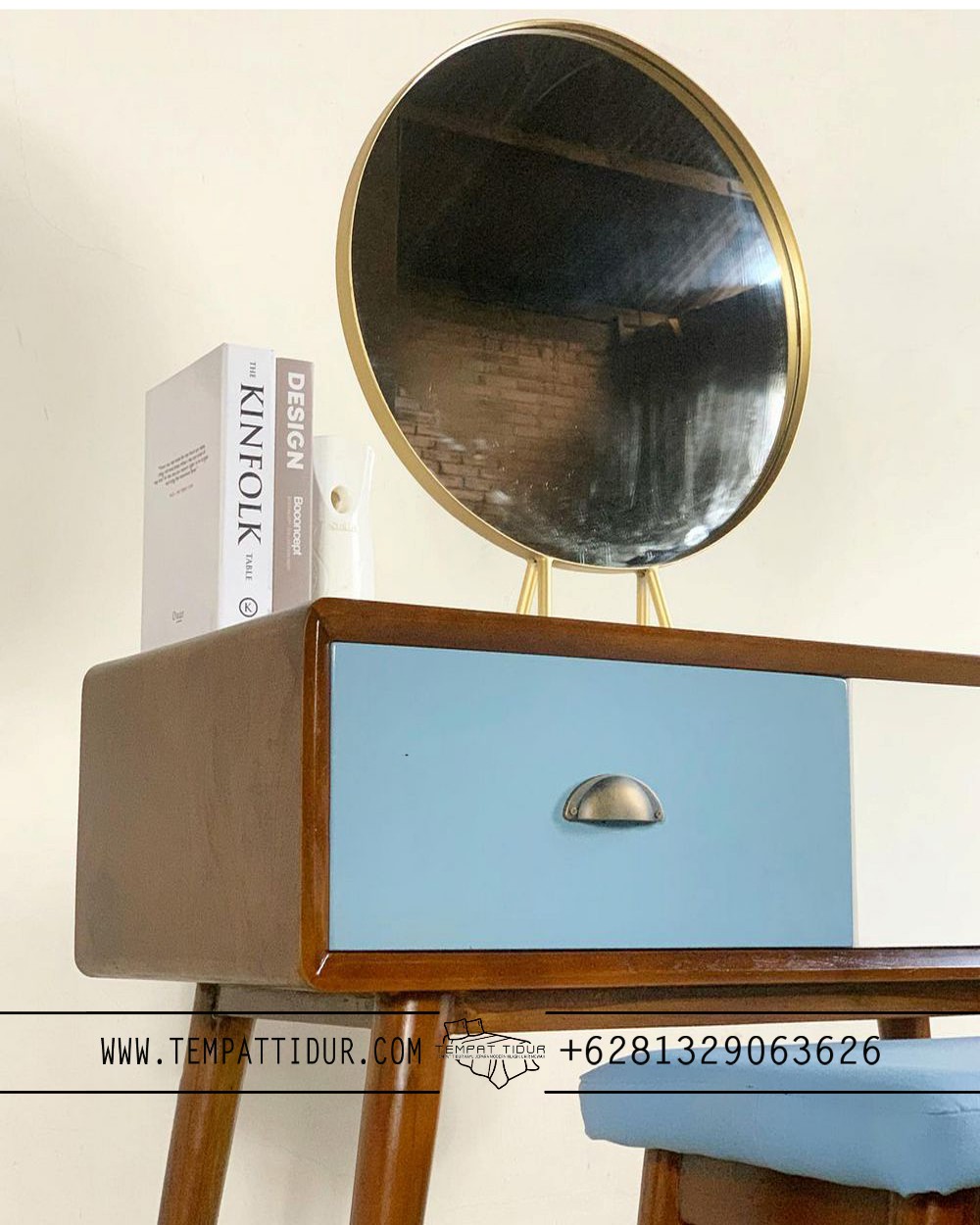 Bayangkan punya sudut rias yang bikin pagimu makin semangat! Ini dia meja rias minimalis retro dengan nuansa pastel lembut dan cermin bulat elegan, dirancang khusus buat kamu yang suka gaya simpel tapi penuh karakter. Dibuat tangan oleh pengrajin ahli di Jepara dari kayu jati pilihan, meja rias ini memadukan desain retro timeless dengan warna-warna kalem yang bikin ruanganmu feel lebih cozy. Nggak cuma cantik, tapi juga super fungsional—lengkap dengan bangku kecil (stool) yang pas banget buat duduk santai siapin penampilan.