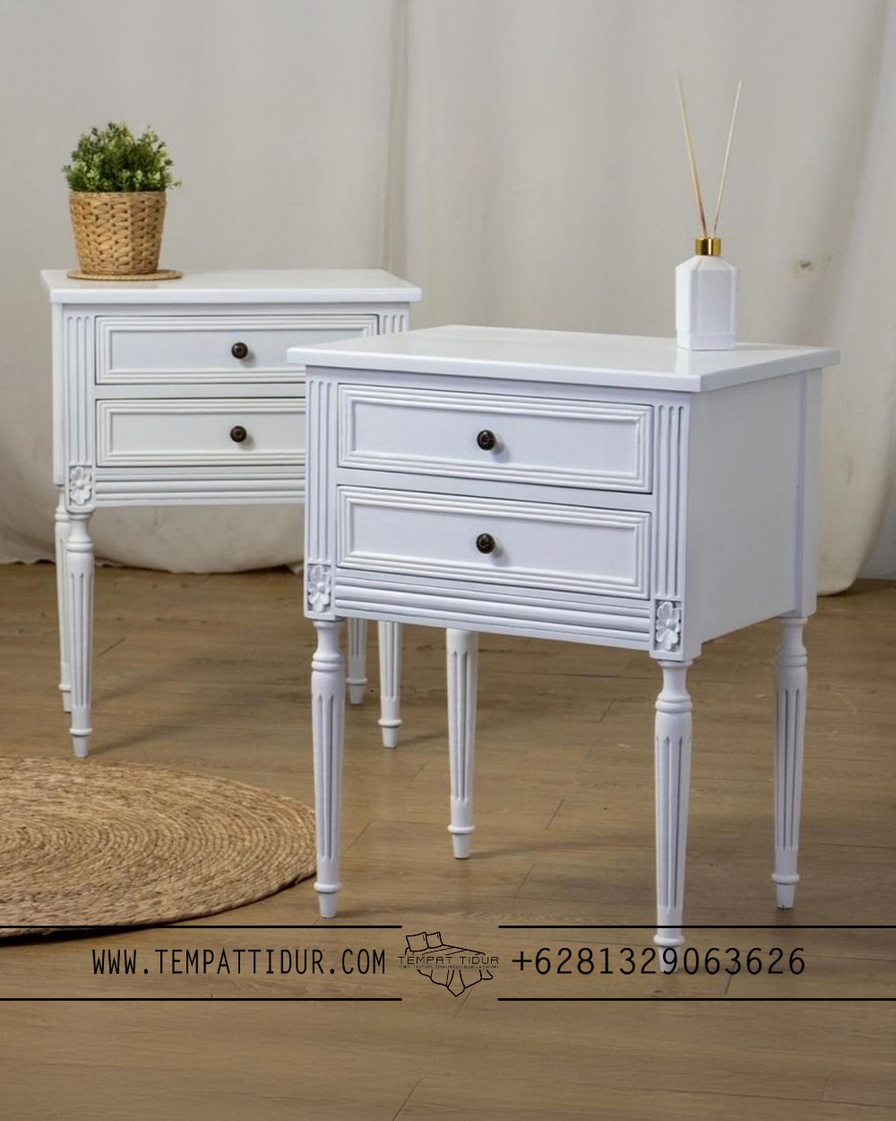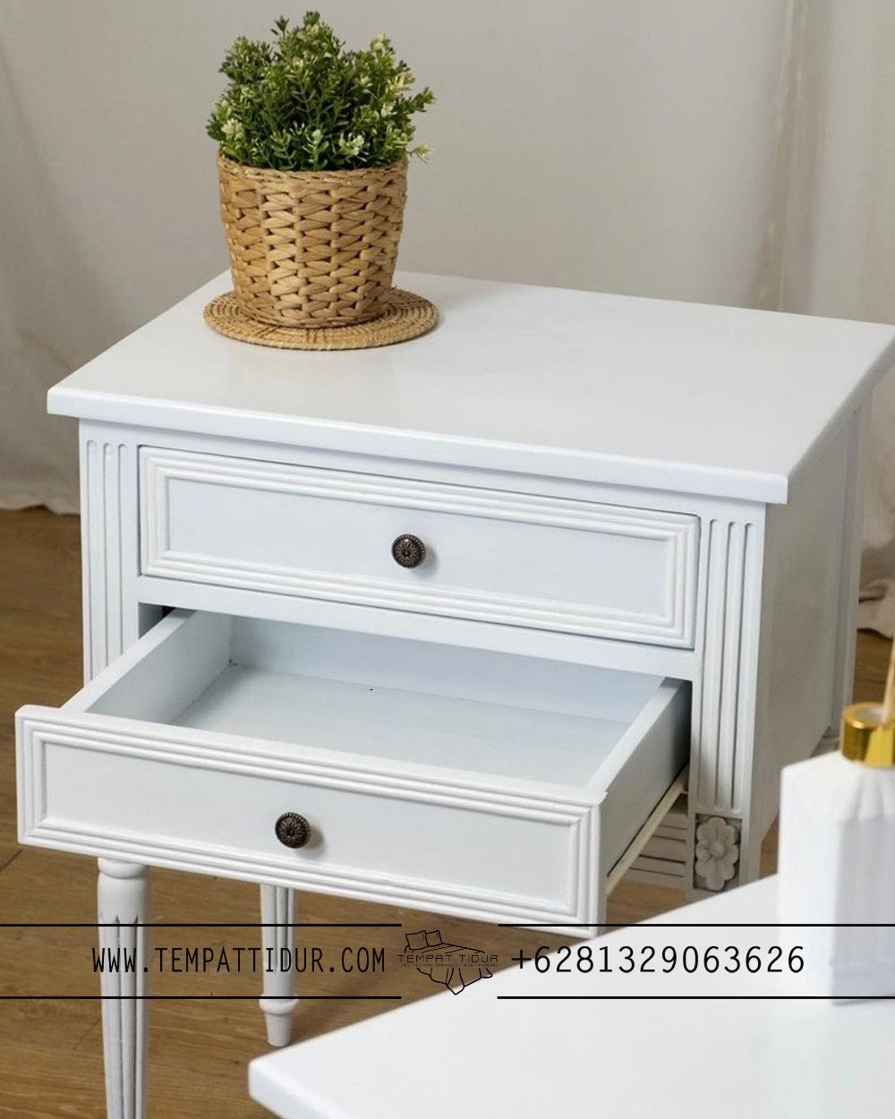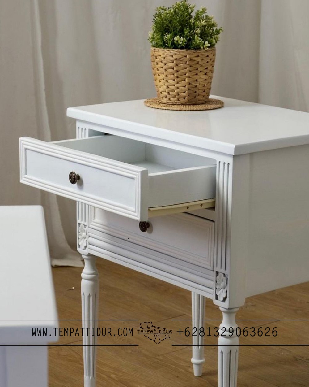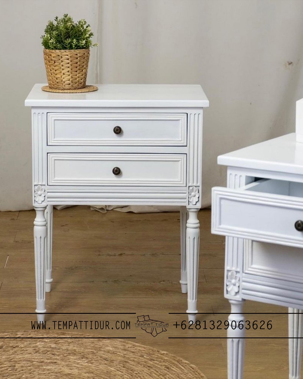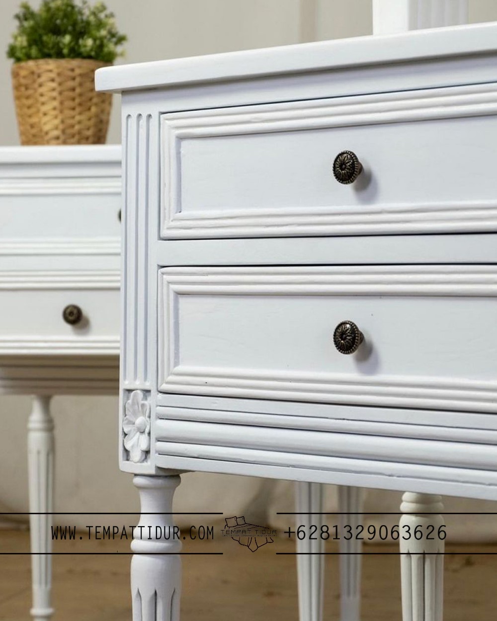 Spesifikasi produk Nakas 2 laci klasik cat duco putih kayu mahoni TT-042